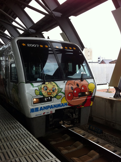 安堵の中テイクオフし、1時間ちょっとで高知龍馬空港に到着。そこかしこ色々と龍馬だらけでしたが、高知駅から乗った特急はまさかのアンパンマン列車。アイアンマン課長が『アンパンマン来るよ』と言ってスマートフォンのカメラを構えたので、つられて撮る。特急で更に2時間移動です。