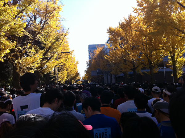 受付を終えた我々は地べたに座り込み、新しいシューズのはき心地とか、最近どうよ的な話をする。その後、ハーフ出場のH氏がひと足先にスタートしていったので、こちらもトイレを済ませて小走りで移動。さあ、スタート1分前です。