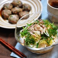 ウ〜ン。大葉を刻むいい香りがしてきた。愛息ふくっCと一緒に台所の母を見張りながら待つ。騒がしい大人(自分)と子どもの野次にも笑顔で手際のいいあきC。薬味たっぷり出汁はあっさり。つるつる爽快に食べられる旨さ・・・! 二人前は軽い。あきC、コメント欄でレシピをよろしく!