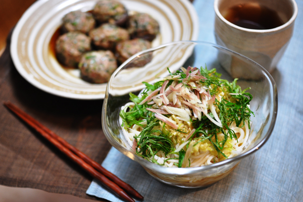 きざんだねぎを加え、茹でた麺にこれをぶっかけて、刻んだ紫蘇とミョウガをのっけて出来上がりです。