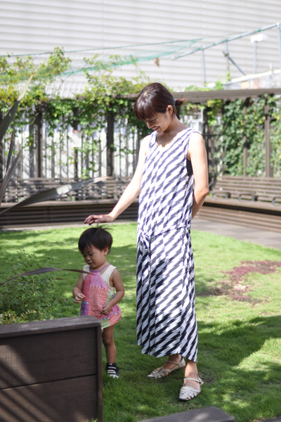 売り場では「マニアックな感じのあの人!」と店員に突進してったあきC、撮影テスト用の模型に興奮の雄叫びをあげまくるふくっちゃま(今月2才)。小田急百貨店の屋上広場で日なたを駆けまわる。時は猛暑日午後3時、母あきCに休みなし!
