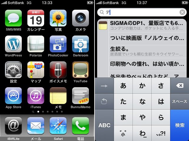 昨夜は鼻息荒く帰宅。数十分に及ぶバックアップののち、無事アップデートが完了。コピー&ペースト・メモのシンクロ・Spotlight検索(写真右)は歓迎すべき進化ですが、一番嬉しいのがメール受信がプッシュ式になったこと! これでサーバーに問い合わせなくてもリアルタイムで受信通知がくるようになりました! わーい。