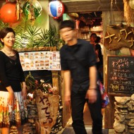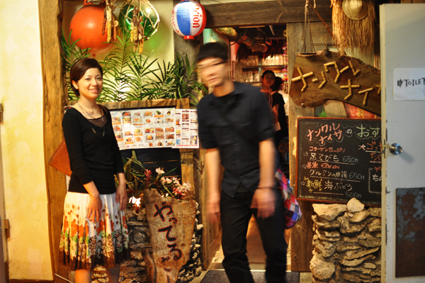 沖縄料理店『ナンクルナイサ』では、お互いにキャッチコピーを付け合う試みにトライ。あきCから素晴らしいコピーをいただき感涙にむせび泣く。あきC、omo氏、後ろに細君氏、右TOILET。