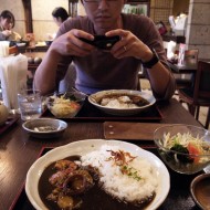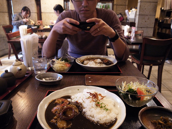 『実は気になってるうどん屋がありましてね。』というイーゴン氏のナビゲートでsimon(さいもん)でランチ。が、看板の写真のシズル感に魅了され、うどんには目もくれず二人揃ってシーフードカレーをオーダー。ルーが黒くて美味しい。