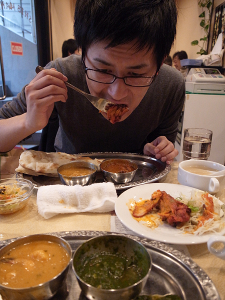 インドカレーが食べたくて、美味しくて安いと評判のシブマハールへ。シブは渋谷の「渋」か否かを議論しながら到着。選べる2種カレーは、ほうれん草&チキンのカレーとエビカレーを選択。ライスorナン、スープとミニサラダがついて800円。イーゴン氏は2種カレーにタンドリーチキンをつけたセット。食べている間は会話無し。
