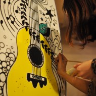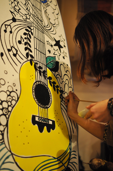 キャンバスはお知り合い所有のサーフボード。立て掛けた状態にも関わらず、曲線の筆裁きも滑らか。約3時間でギターを洋梨に見立てた作品が完成! このボード、てっきりお店に飾るのかと思ったら、後日クリア塗装して本当に使用するそうです。自分の作品が波に乗るなんて素敵だね!