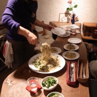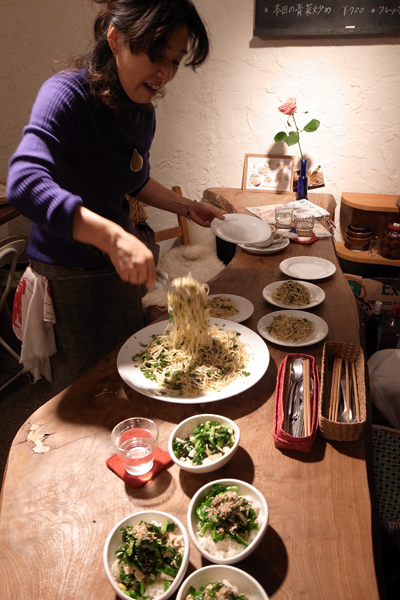 憧れのまかない飯デイ・バイ・デイ しばらくしてオーナーの綾さんがまかない飯を作り始めましたよ。まかない飯は、お客さんが途切れたタイミングでサササと素早く手際良く。出来上がったのは「パセリとシソたっぷりペペロンチーノ」と「ニラと豆腐のミニナムル丼」。気付くと綾さんが我々の分も取り分けていてくれました! 野菜たっぷりの緑の食卓です。 来月から新たな味覚を求めてインドに旅立つ綾さん。その間の約一ヶ月間はお店は休業だそうです。新メニューをわくわくしながら待ってます! Tweet 続けて読みたい: 関連記事が見つかりません(ブラウザのリロードをお試しください) 2010/1/24 タソ 0 comments on “憧れのまかない飯”Add yours → コメントを残す コメントをキャンセル メールアドレスが公開されることはありません。コメント 名前 メール サイト コメントの返信をメールで受け取る