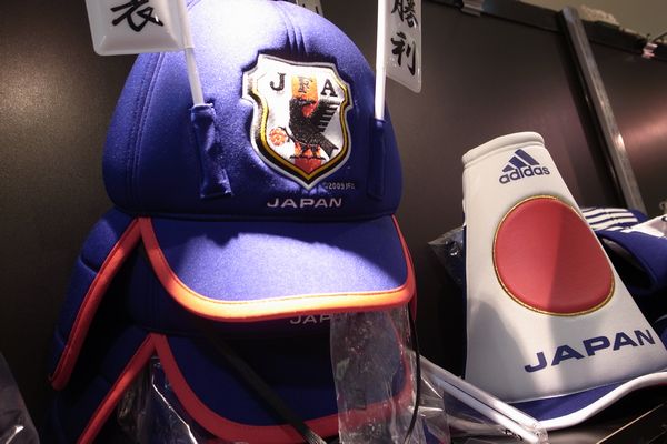 渋谷駅直結の東急百貨店にアディダスショップが出店中です。代表ユニフォームをはじめ、青々とした応援グッズが並んでいます。日本のサポーターといえば、青いアフロをかぶった人を思い出してしまいますが、それだけじゃあないんですね。カブト型や富士山型ハットもありました。ポリエステル100%でかぶり心地もよさそう。