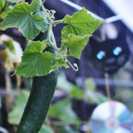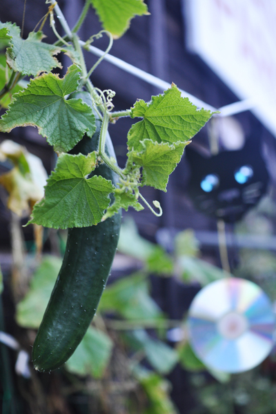 設備投資や世話の手間を考えれば、野菜は買った方が安いかもしれません。でも採りたての無農薬野菜を食べられるのは自家菜園の醍醐味。黒猫とCD盤の監視により立派に育ったきゅうりは、この日酢の物になりました。